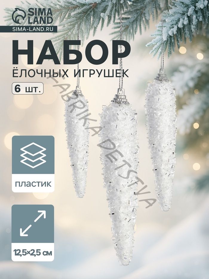 Ёлочные игрушки набор 6 шт. «Сосулька пушистая сияние» 12.5x2.5 см, белый
