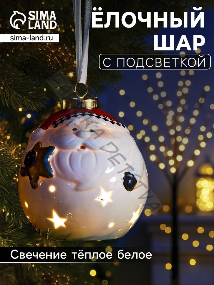 Ёлочный шар с подсветкой «Дед Мороз», 10x8.6x8.6 см, 1 LED, от батареек LR44x3, керамика, свечение тёплое белое