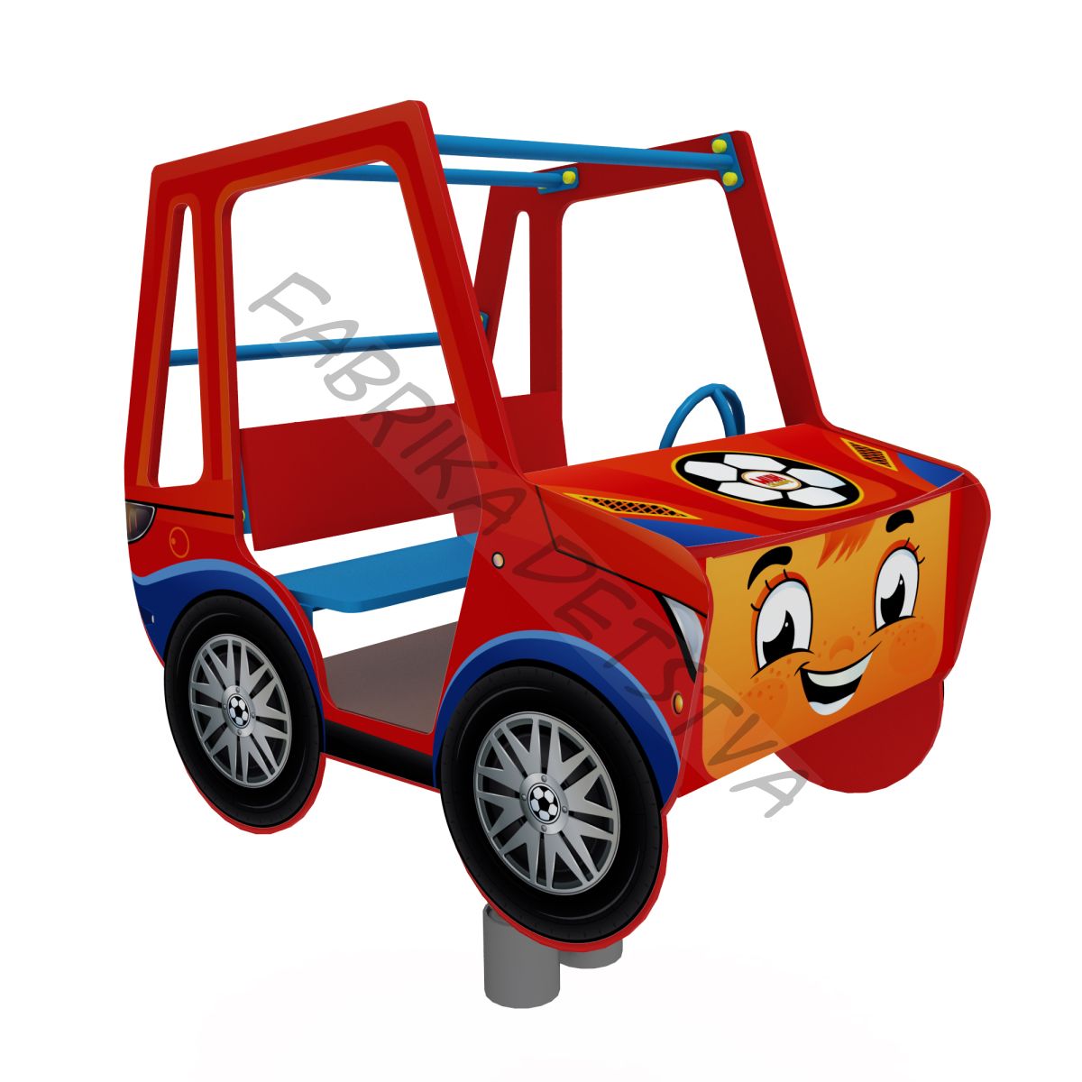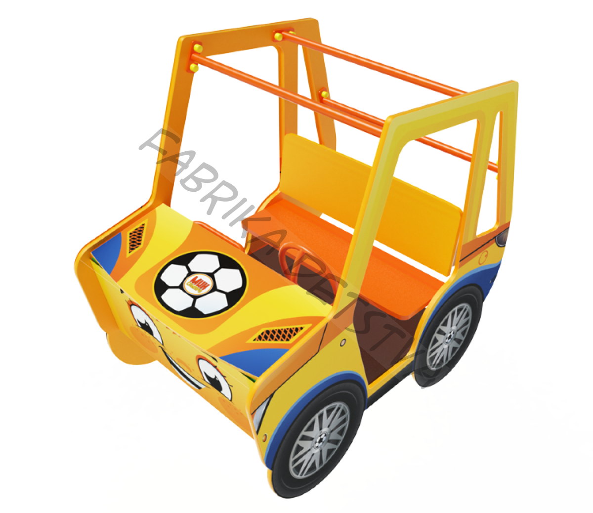 Борта стилизованы под машинку и выполнены из влагостойкой фанеры толщиной 18 мм и состоят из боковых бортов размером 1220х1000х18 мм красного цвета - 2 шт, капота 820х400х18 мм синего цвета - 1 шт, приборной панели (820х250х18 мм), передней панели (820х390х18 мм), колес (диаметром 400 мм толщина фанеры 9 мм), на передней панели имеются фары желтого цвета из влагостойкой фанеры толщиной 9 мм, диаметром 120 мм и решетка радиатора красного цвета (690х220х9 мм). |