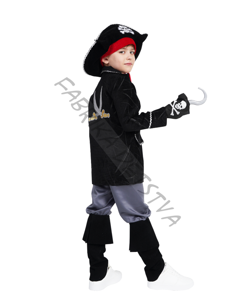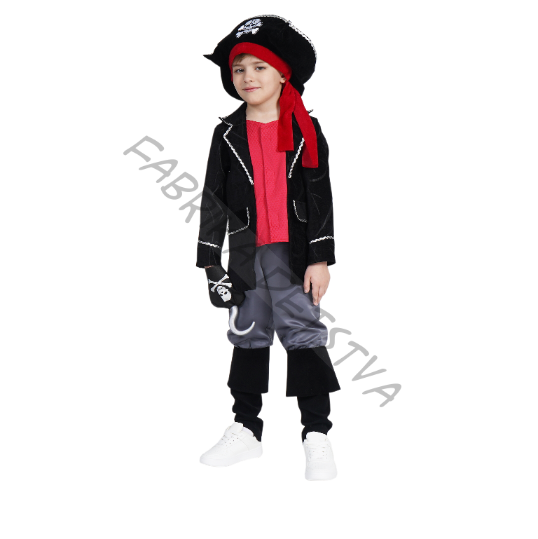 головной убор, жакет с имитацией жилета, брюки с притаченными ботфортами и варежка с крюком.