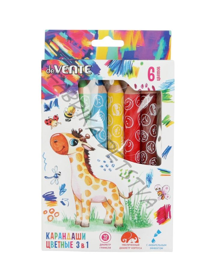 Карандаши цветные акварельные 6 цветов, мини deVENTE Jumbo 3 в 1 супер мягкие, d=14.7 мм; L-110 мм с точилкой