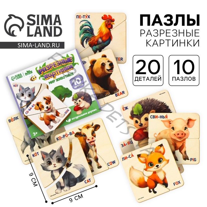 Деревянные пазлы — это увлекательная и долговечная головоломка. Крупные детали легко собирать, поэтому они подходят даже самым маленьким. Особенности пазлов 20 деталей 10 картинок 9 х 9 см На каждой картинке есть название животного на русском и английском языке Пазлы рекомендованы для детей от 3 лет В чём польза от занятий с пазлами Во время сборки пазла дети могут изучить животный мир, узнать как пишется и читается название зверька на английском и на русском языке. Это поможет расширить их знания об окружающем мире и научиться читать. Складывая картинки из деталей, ребёнок развивает воображение, эмоциональное восприятие, мелкую моторику и осваивает навыки конструирования.