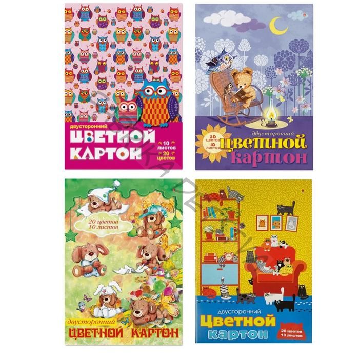 Картон цветной двухсторонний А4, 10 листов, 20 цветов "Мультики", 200г/м2, мелованный, 4 вида МИКС