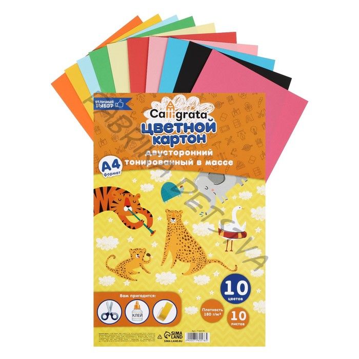 Картон цветной двусторонний А4, тонированный в массе, 10 листов, 10 цветов, 180 г/м2