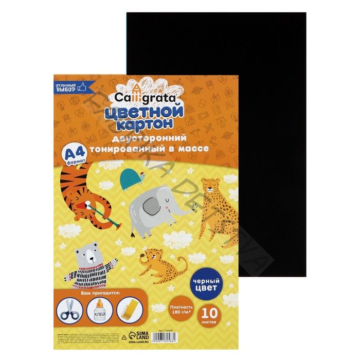 Картон цветной двусторонний А4, тонированный в массе, 10 листов, 180 г/м2, чёрный