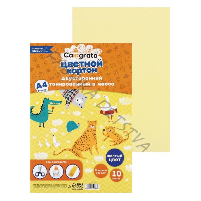 Картон цветной двусторонний А4, тонированный в массе, 10 листов, 180 г/м2, жёлтый