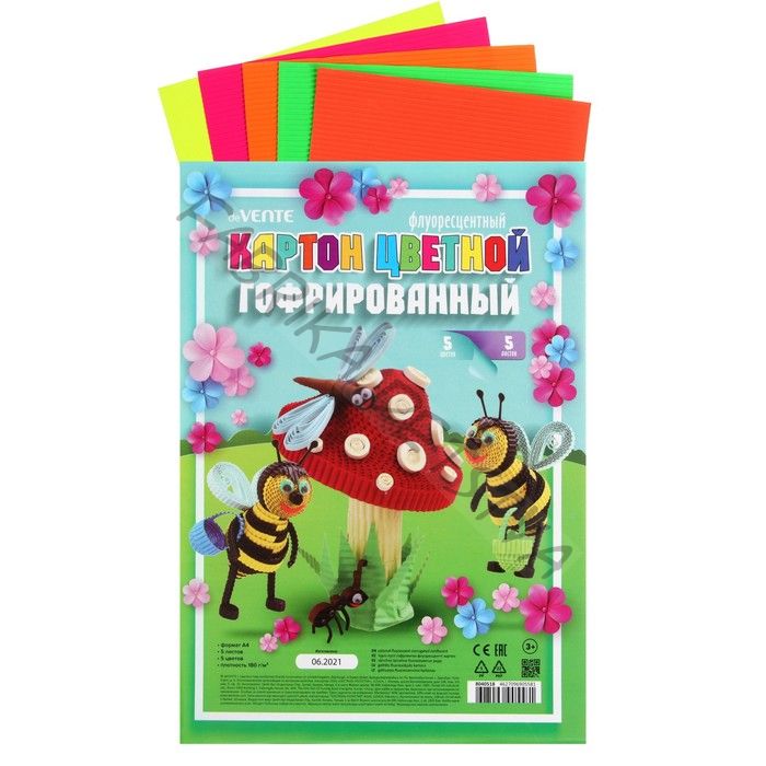 Картон цветной гофрированный, флуоресцентный, А4, 5 листов х 5 цветов, deVENTE, 180 г/м2, в пластиковом пакете с европодвесом