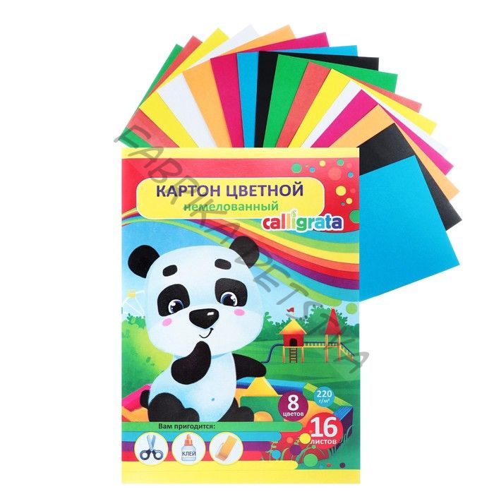 Картон цветной немелованный А4 16 листов, 8 цветов, «Панда» , плотность 220 г/м2