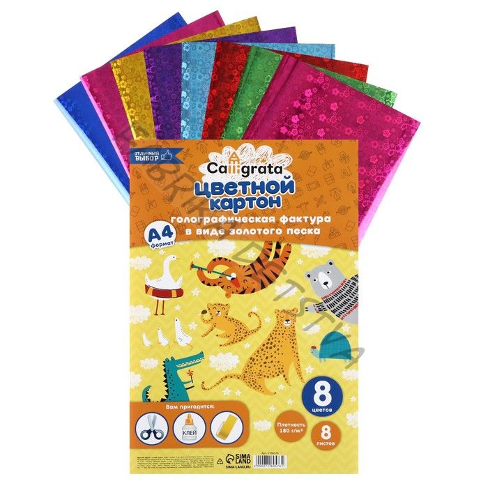 Картон голографический А4, 8 листов,8 цветов, золотой песок, 180 г/м2
