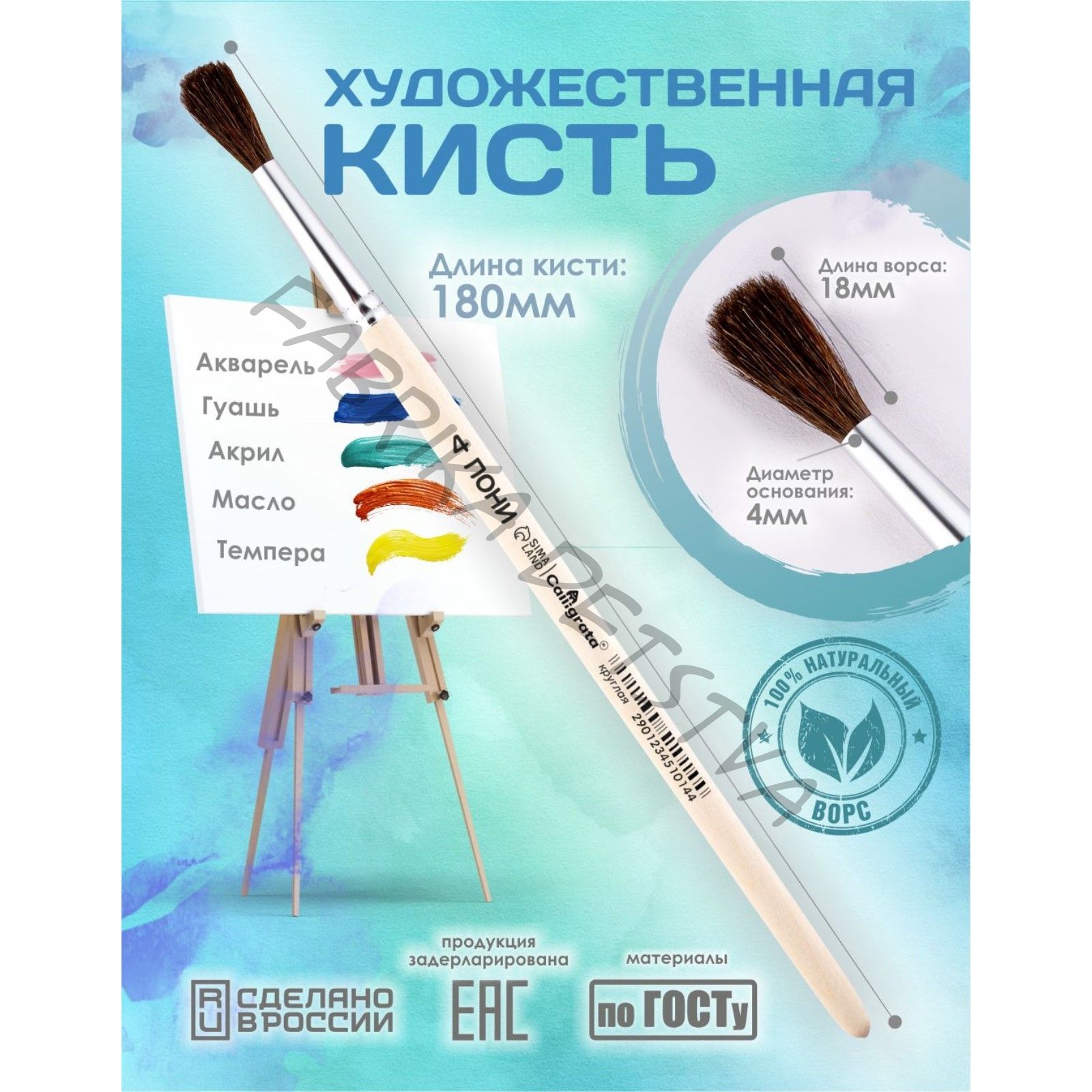 Кисть для рисования, Пони круглая № 4 (диаметр обоймы 4 мм; длина волоса 18 мм), деревянная ручка