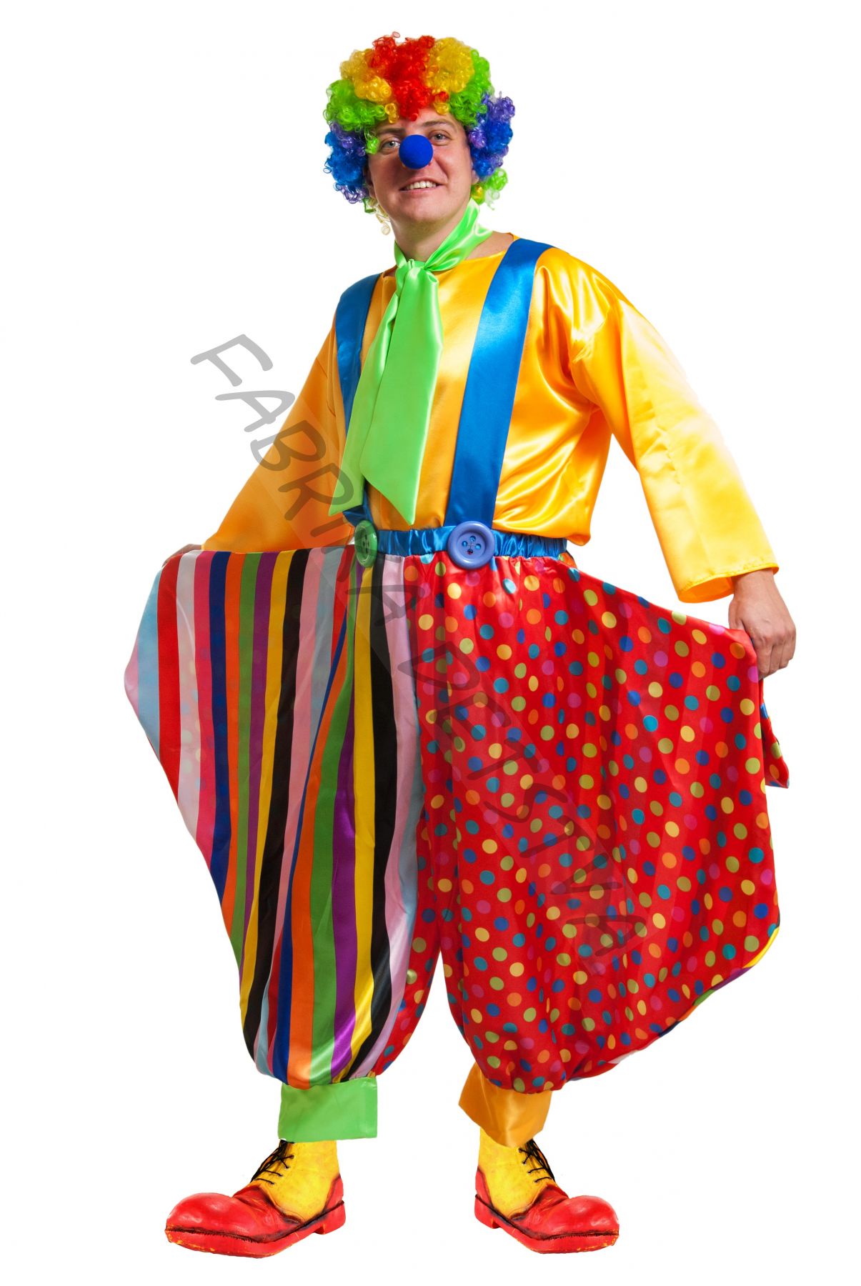 яркий разноцветный комбинезон, рубаха, галстук, образ дополняют нос в ассортименте жёлтого, красного или синего цвета и парик.