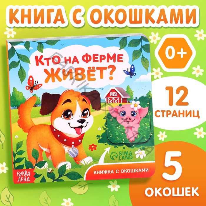Книжка картонная с окошками «Кто на ферме живёт?», 12 стр.