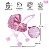 Маленькие леди с самого раннего детства проявляют интерес к сюжетно-ролевым играм, в процессе которых они интуитивно повторяют действия своих родителей. Во время игры происходит развитие материнских навыков: девочка заботится о кукле, кормит её с ложечки, пеленает и гуляет с ней. Именно по этим причинам коляска для куклы не просто полезна, но и необходима для того, чтобы разнообразить досуг ребёнка. Изделие подходит для любой погоды. Благодаря крепким пластиковым колёсам и металлическому каркасу коляска очень устойчива при езде. Вы можете положить куколку в люльку и поднять козырёк, чтобы ей было тепло. Высота от пола до ручки (не регулируется) — 55 см; размер люльки — 33 x 17 x 8 см; размер коляски — 49 x 23,5 x 55 см. Играйте и развивайтесь вместе с нами!