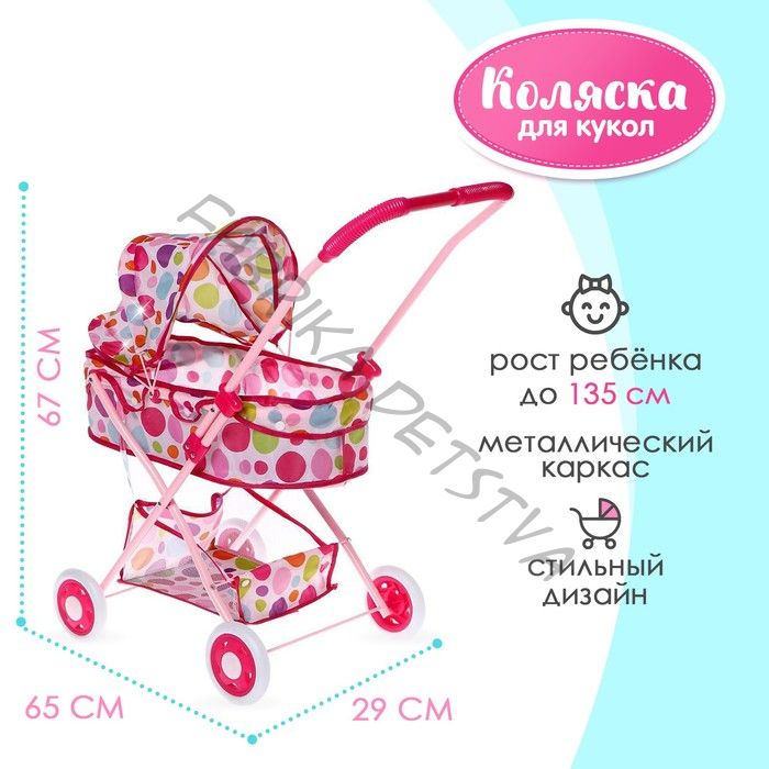 Коляску для куклы можно назвать одной из самых любимых игрушек для девочек. Маленькие леди с раннего детства проявляют интерес к сюжетно-ролевым играм, в процессе которых они интуитивно повторяют действия своих родителей. Особенности коляски Каркас выполнен из металла. Люлька съёмная, выполнена из ткани. Подходит для кукол до 46 см. Размер коляски: 65 x 29 x 67 см. Ручка не регулируется. Подходит для детей ростом до 135 см. Складной капюшон. Функции качания нет. Коляска складывается и занимает мало места. Корзина в комплекте будет служить местом хранения для всех необходимых вещей ребёнка и его пупса. Малыш может катать своих пупсов, кукол и мягких игрушек в любое время года, даже зимой. Играть в куклы — полезно Для девочек это не только развлечение, но и развитие материнских навыков, ведь так интересно заботиться о маленьком человечке, кормить его с ложечки, пеленать и просто гулять. Именно по этим причинам коляска для куклы не просто полезна, но и необходима, чтобы разнообразить досуг ребёнка.