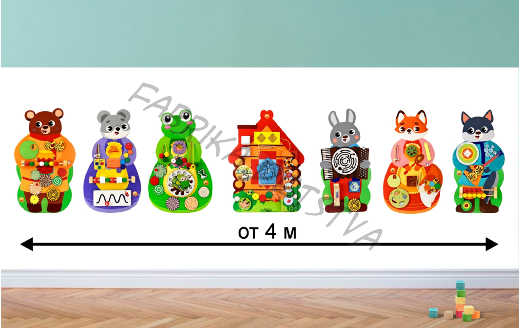 Размер одного бизиборда 75х50 см. Комплект подходит для оформления стены длиной от 4 м.