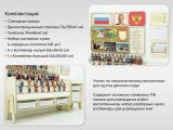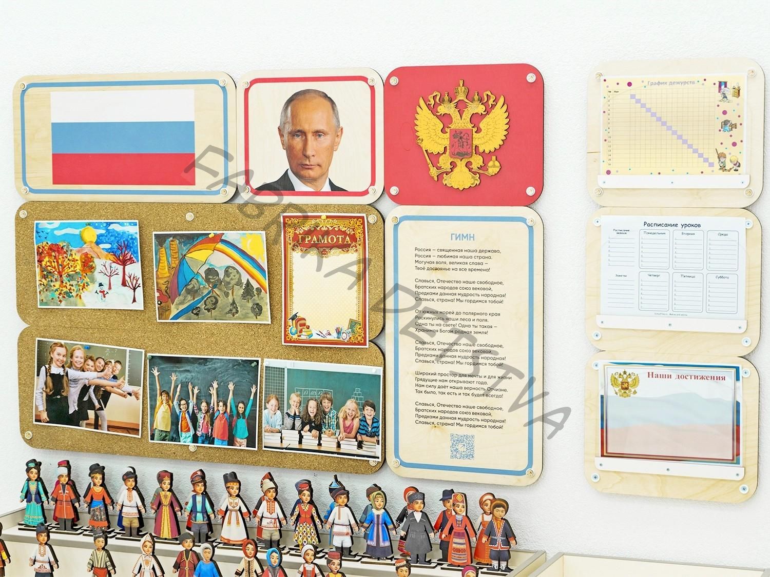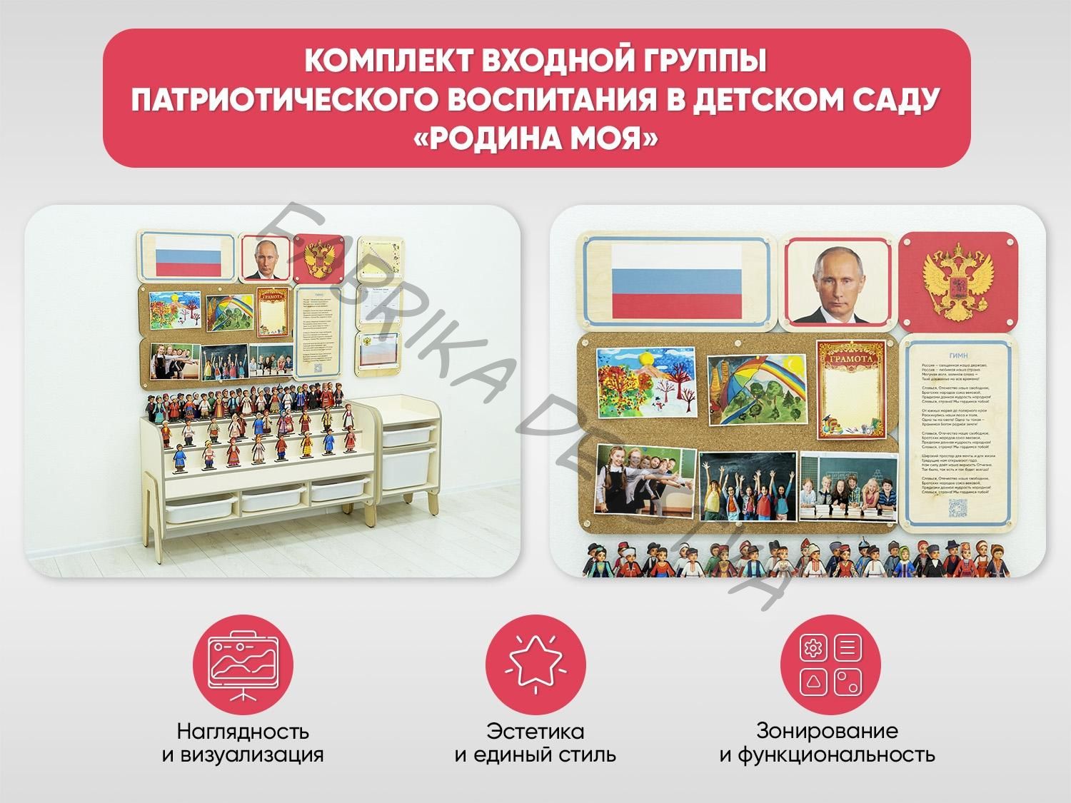 Уголок по патриотическому воспитанию для группы детского сада. Содержит основную символику РФ, панели для размещения работ воспитанников, набор разборных кукол, контейнеры для размещения книг. Соответствует требованиям ФГОС 3.