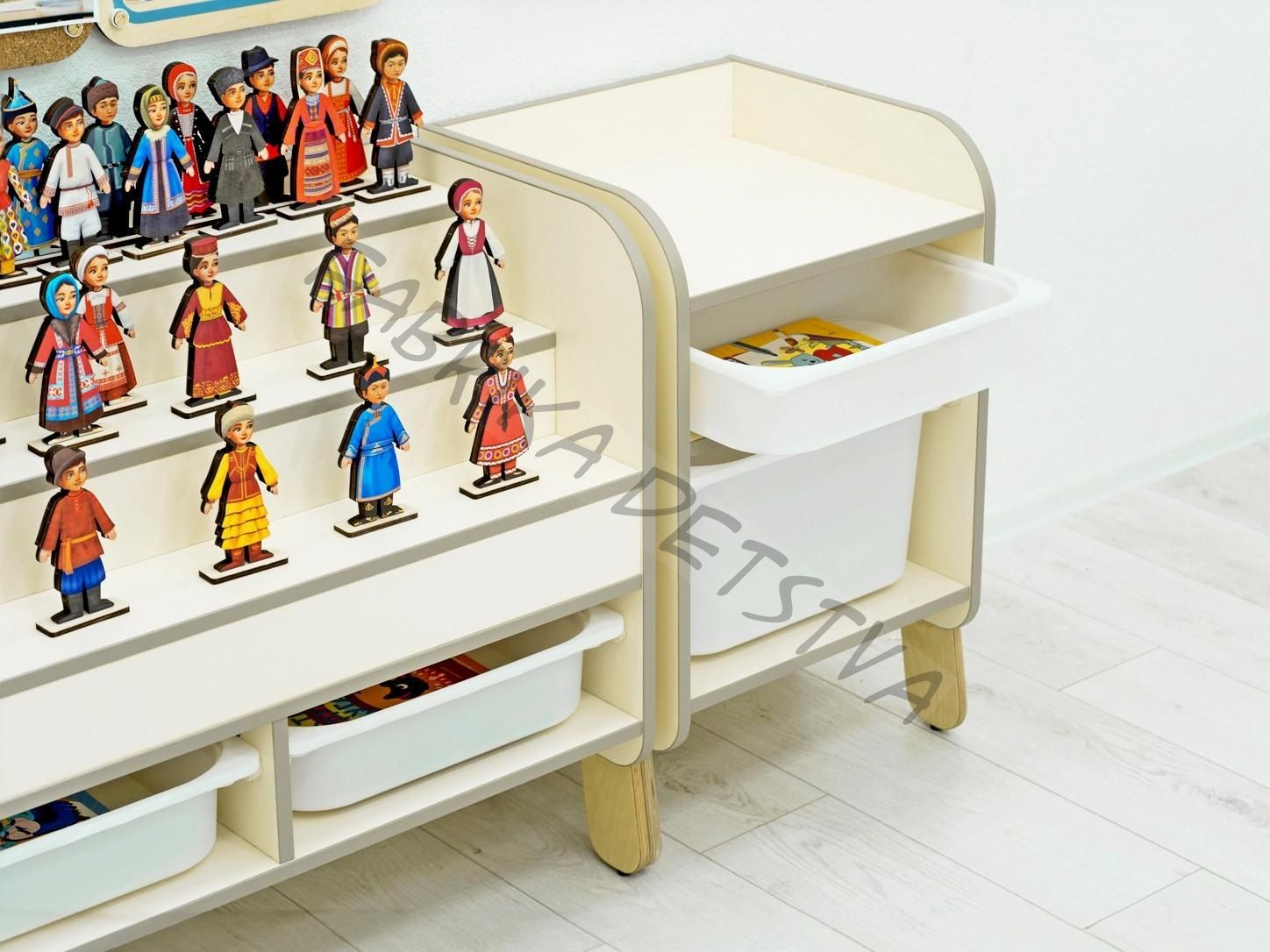 Для изучения национального разнообразия России в комплектации есть куклы в народных костюмах (24 национальности, 48 кукол). Они выполнены из берёзовой фанеры и ДВП с нанесением принтерной печати. Куклы разборные: голова, верхняя часть туловища и нижняя часть надеваются на основу-подставку. Играя в них, дети могут составлять различные вариации одежды куколок – правильные и неправильные, искать пары, разыгрывать сюжетно-ролевые сценки, параллельно запоминая национальности и их традиционные костюмы.
