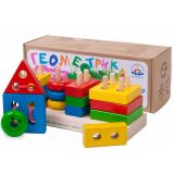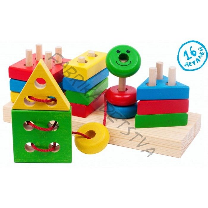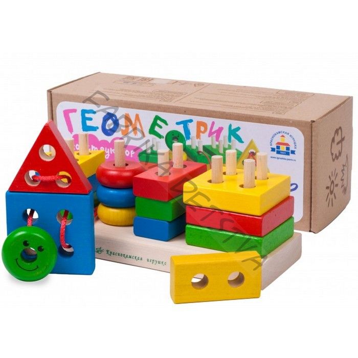 Россия.Краснокамская игрушка. Конструктор «Геометрик» — это платформа со штырьками, на которые нужно правильно подобрать и надеть разные геометрические фигуры: квадраты, треугольники, прямоугольники и круги. Игра научит ребёнка различать цвета и предметы по форме.