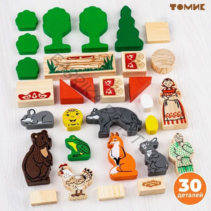 Томик. Конструктор «Первые сказки: Колобок, Курочка Ряба, Теремок» — это увлекательный и развивающий набор для детей от 3 лет. В наборе 30 деревянных элементов, выполненных из безопасного материала. Детали конструктора позволяют детям разыгрывать сцены из любимых сказок и придумывать свои истории, развивая мелкую моторику, воображение и речь