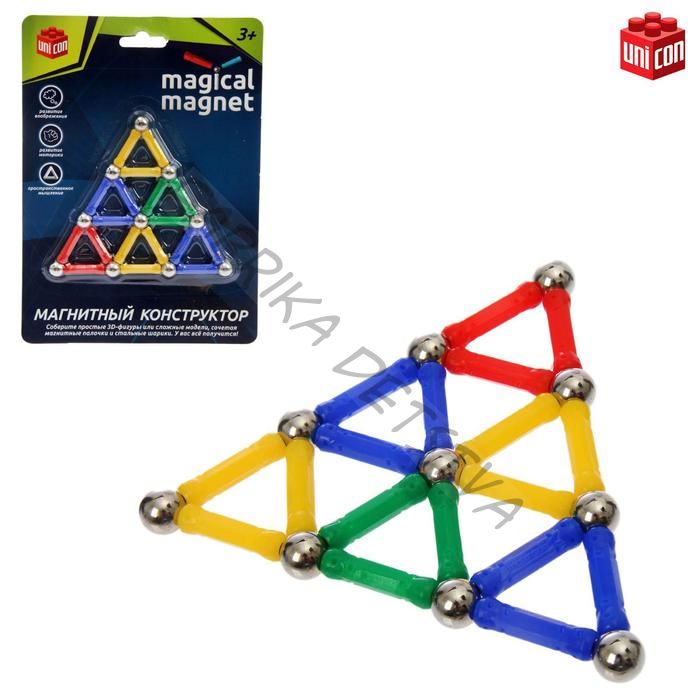 Учимся весело Думаете, наука это сложно? С невероятным магнитным конструктором малыш узнает много интересного о физических явлениях, магнетизме и геометрии. Из ярких палочек и металлических шариков получится собрать необычные трёхмерные модели: для этого комбинируйте детали, трансформируйте фигуры и не бойтесь экспериментировать! Почувствуйте силу притяжения Игры с магнитным конструктором пробудят фантазию ребёнка, поспособствуют развитию воображения, мелкой моторики, эмоционального восприятия, формированию пространственного и логического мышления. В наборе 28 деталей: 10 шариков, 18 палочек. Размеры элементов: Длина палочки: 2,7 см. Диаметр шара: 0,7 см. Для детей старше 6 лет