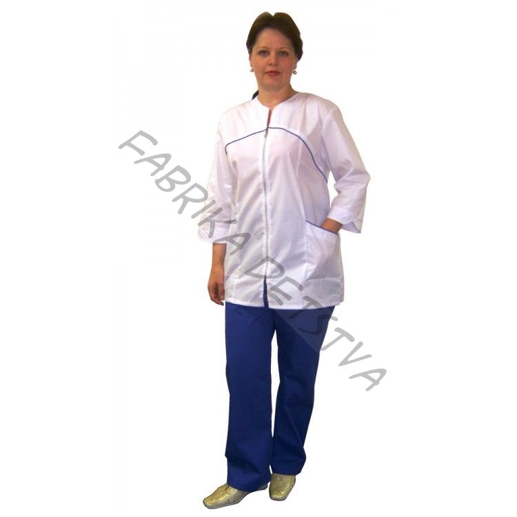 состав: 50% хлопок, 50% пэ, цвет белый верх. брюки василек или изумруд, на молнии, рукав 3/4.