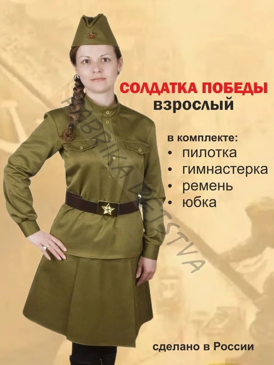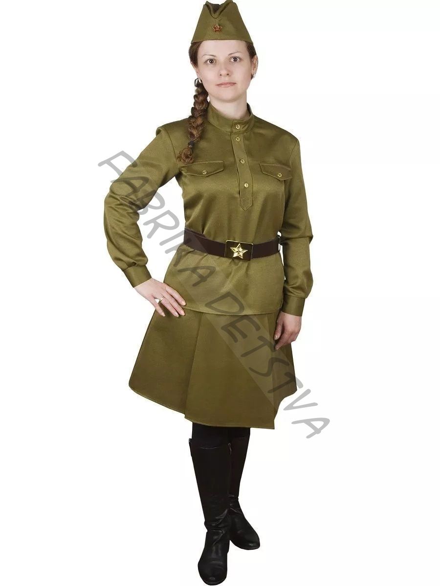 Форма военная ВОВ. Прекрасно подойдёт для военно-патриотических праздников, 23-го февраля, 9-го мая, сценических и театральных постановок. Гимнастёрка прямого силуэта, с длинным рукавом, воротник-стойка. Пилотка складная старого военного образца со звездой. Форменная юбка ВОВ, чуть расширенная к низу, с двумя складками по переду создаёт военный образ и переносит во времена Великой отечественной войны. Пояс у юбки на резине, хорошо подойдет на любую талию, не сковывает движений и поможет исполнить военный танец отважной боевой подруге и с головой окунуться в атмосферу тех дней.