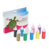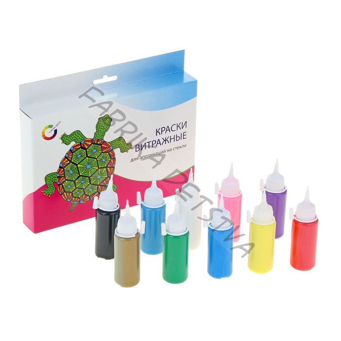 Краски предназначены для создания съемных витражных аппликаций. Состав набора Коробка с подвесом - 1 шт. Внутренняя коробка – 1 шт. Полиэтиленовая пленка (пакетик) Контурные рисунки – 5 шт. Советы для начинающих – 1 шт. Состав 10 флаконов Особенности Контур специальный чёрный 27 мл, специальный золото 27 мл с градуированными носиками для создания контура определенной толщины. 8 флаконов по 27 мл с красками следующих цветов: синий, зеленый, красный, желтый, фиолетовый, голубой флуоресцентный, розовый флуоресцентный, прозрачный с блёстками. Контуры могут быть использованы как дополнительные цвета. Флаконы с красками имеют носик-дозатор, диаметр отверстия в котором можно выбрать в зависимости от характера работы. Для изготовления аппликаций используются прилагаемые контурные рисунки, входящие в набор, или собственные рисунки. После высыхания краски образуют разноцветную полупрозрачную эластичную пленку, похожую на настоящий витраж. Высохшие аппликации можно несколько раз снимать и перемещать на стекло, зеркала и другие гладкие поверхности, где они будут держаться без использования клея. При удалении аппликаций не остается следов на поверхности. Краски изготовлены на основе водной дисперсии и высококачественных пигментных паст