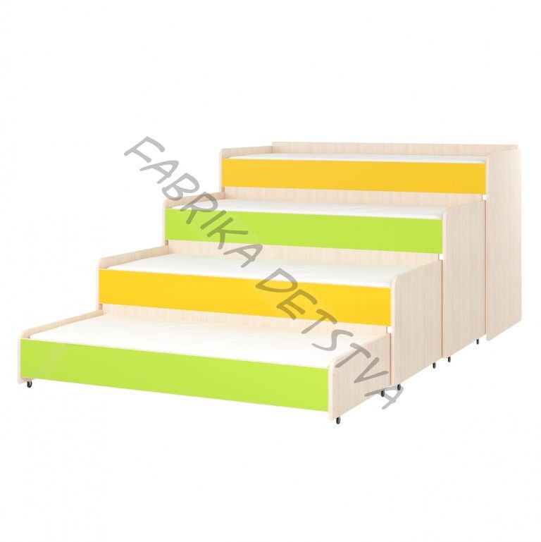 Экономит пространство .Кровать изготовлена из ЛДСП 16 мм, все детали обработаны кромкой ПВХ 2мм.Ложе МДФ 8мм.Корпус дуб молочный Кровать представляет собой систему выдвижных элементов. Единая конструкция представляет собой совокупность четырех кроватей, собирающихся по типу «матрешки». Лежак представляет собой каркас соединенный планками из ЛДСП шириной не менее 50 мм. Задние бортики кроватей выступают, что при выдвижении позволяет кроватям цепляться друг за друга. Нижние части опор(боковин) кроватей оборудованы колесными опорами. Все углы закруглены.