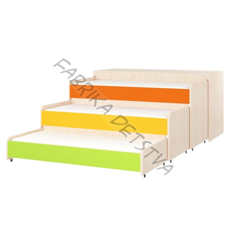 Кровать детская 3-х ярусная, трансформируется из одной в три спальных места. Размер в разложенном состоянии 1856 см. Размер ложе 1- 618*1400, 2- 600*1350см, 3- 600*1300 см. Экономит пространство .Кровать изготовлена из ЛДСП 16 мм, все детали обработаны кромкой ПВХ 2мм.Ложе МДФ 8мм.Корпус дуб молочный Кровать представляет собой систему выдвижных элементов. Единая конструкция представляет собой совокупность трех кроватей, собирающихся по типу «матрешки». Лежак представляет собой каркас соединенный планками из ЛДСП шириной не менее 50 мм. Задние бортики кроватей выступают, что при выдвижении позволяет кроватям цепляться друг за друга. Нижние части опор(боковин) кроватей оборудованы колесными опорами. Все углы закруглены.