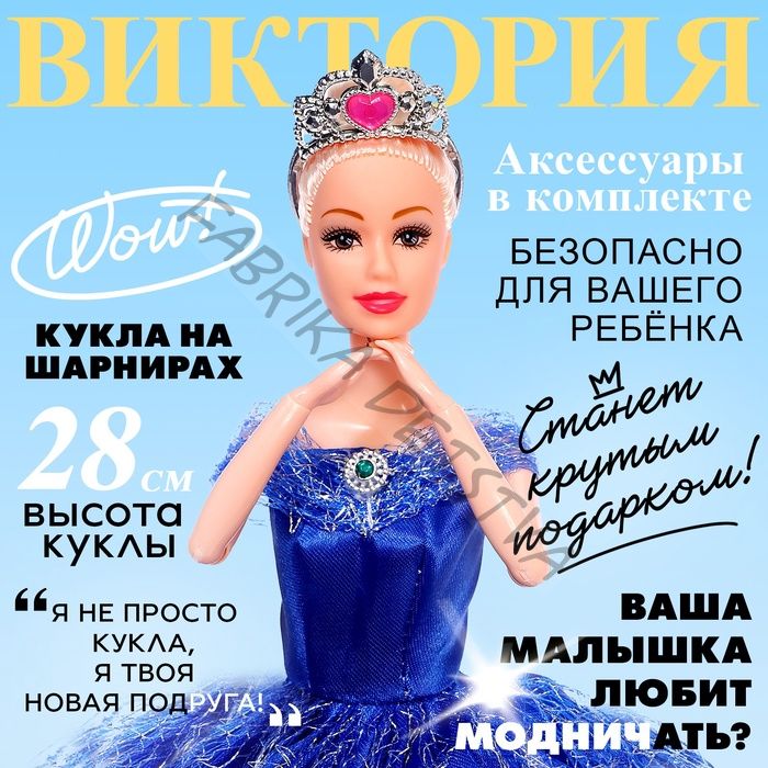 Ваша принцесса любит модничать и играть в куклы? Тогда эта игрушка будет радовать её каждый день! Длинные волосы Виктории позволят вам сделать любую причёску. Фантазируйте и придумайте свои наряды для куклы. Кукла шарнирная. Её высота — 28 см. Она станет желанным подарком для каждой маленькой принцессы.
