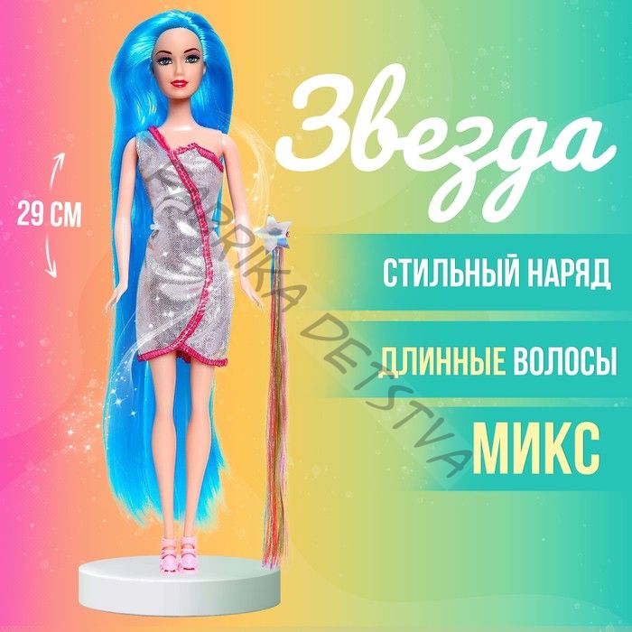 Девочка обожает вечеринки и модные образы? Порадуйте её этим набором! В него входит красивая куколка с шикарными локонами и цветные трессы. Девочка потренируется делать причёски и экспериментировать со стилем. Потренировавшись на кукле, малышка сможет сделать необычную причёску себе. В комплекте идёт искусственная прядь — трессы. Она легко крепится и снимается, не повреждая волосы. Модельная кукла выполнена из пластика. Волосы прошиты по всей голове. Её высота — 29 см. Набор рекомендован юным модницам старше 3 лет.