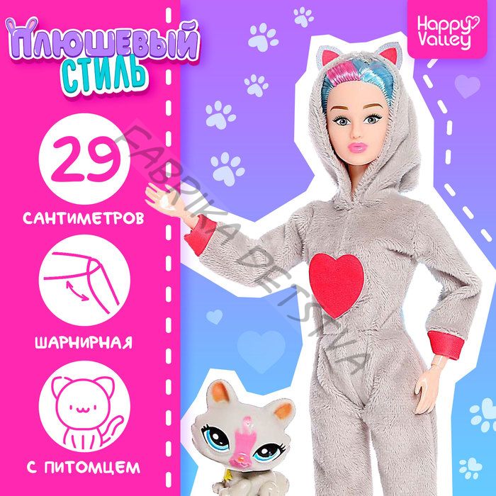 Ваша принцесса любит играть в куклы и ухаживать за животными? Тогда набор с куклой и питомцем точно порадует её! Ребёнок сможет придумать множество ярких сюжетов с кошечкой. Набор упакован в красочную коробочку, поэтому его можно вручить в подарок даже без дополнительной праздничной упаковки. Подробнее об игрушках Высота куклы — 29 см, питомца — 5 см. Шарнирная в плечах, локтях, кистях рук, бёдрах и коленях, что позволит придавать естественные позы и сделает игру более увлекательной. Длинные волосы куклы, прошитые по окружности головы и пробору, позволяют делать креативные причёски, будь то косы или локоны. Одежда легко снимается, поэтому ребёнок сможет менять образы и почувствует себя настоящим стилистом! Подходит для детей в возрасте от 3 лет. Играть в куклы — полезно Взаимодействуя с такими игрушками, девочка осваивает социальные роли, учится обращаться с животными, тренирует фантазию и эстетический вкуса.