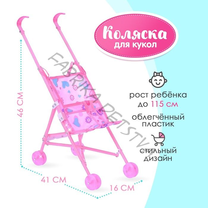 Коляска-трость для кукол станет любимой игрушкой дочурки. Она выполнена из безопасных материалов и представляет собой отличный вариант для летних прогулок с «карапузом». Игрушку можно складывать, в собранном виде она удобно поместится где угодно. Коляска выполнена из облегчённого пластика. Катая куклу в коляске, маленькая леди научится заботе и ответственности, при этом у неё разовьются воображение и эмоциональное восприятие. Размер сиденья составляет 14 x 15 см. Спинки — 13 x 18 см. Товар предназначен для детей от 4 лет. Рекомендуется использовать под присмотром взрослых.