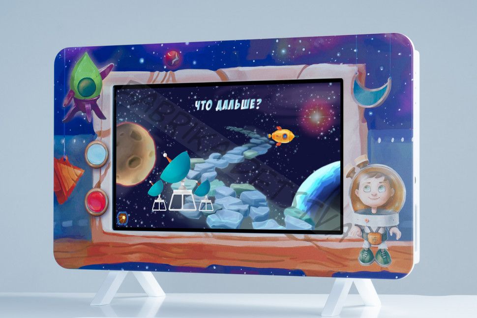 Интерактивная настенная панель оформлена в космическом стиле. Она позволяет проводить игровые занятия с детьми по всей программе дошкольной подготовки. Установленное на панель ПО «АЛМА Дошкольное Образование» содержит 80 обучающих игр и 110 тестов на развитие памяти, внимания и логики, дети учатся счёту и английскому языку. Волшебная раскраска «Оживариум» стимулирует творческие способности малышей, а интерактивный квест «5 Островов» закрепляет навыки, нужные для успешного обучения в школе.