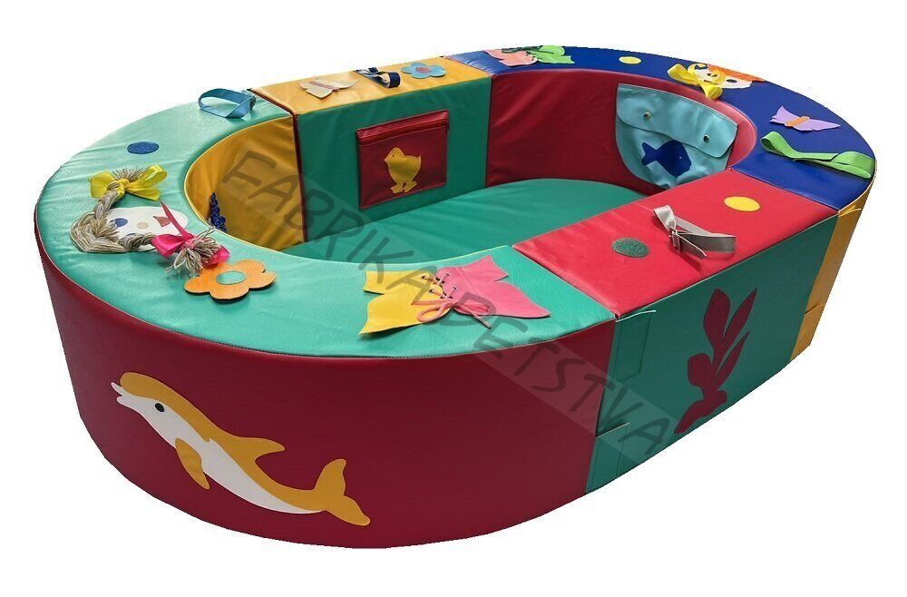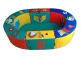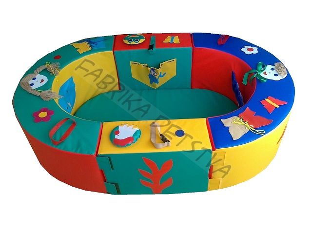 Манеж состоит из мягких модулей. Они соединяются друг с другом с помощью контактной ленты, при необходимости манеж можно разобрать и сложить для более компактного хранения. Модули манежа изготовлены из винилискожи ярких цветов. На их поверхности в доступных для детей местах предусмотрены различные дидактические элементы для развития мелкой моторики рук. Манеж можно использовать как сухой бассейн.