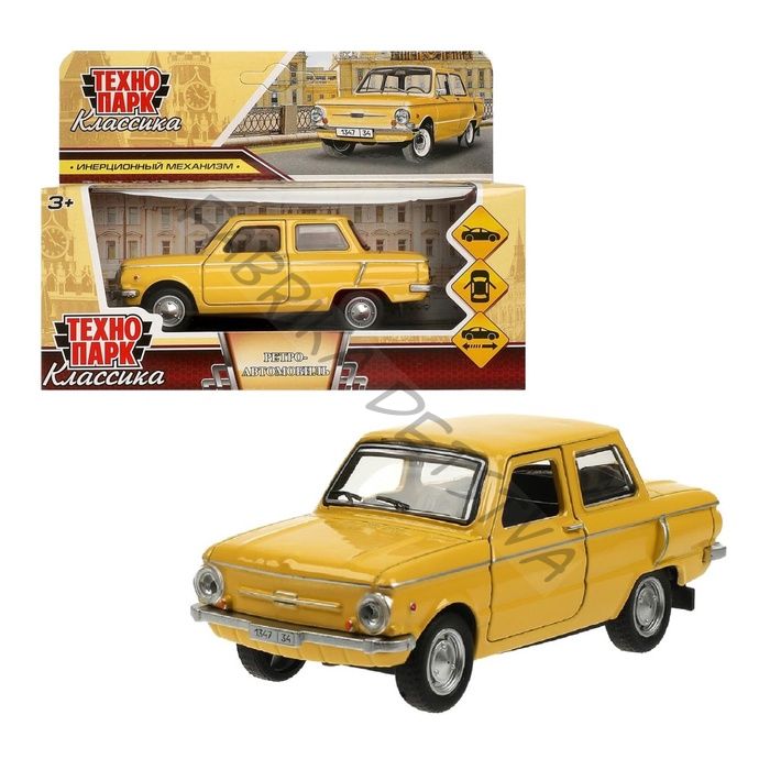 Машинка металлическая «ЗАЗ-968А», ретро - модель «Запорожец», открываются двери, багажник, инерция, 12 см жёлтый