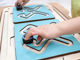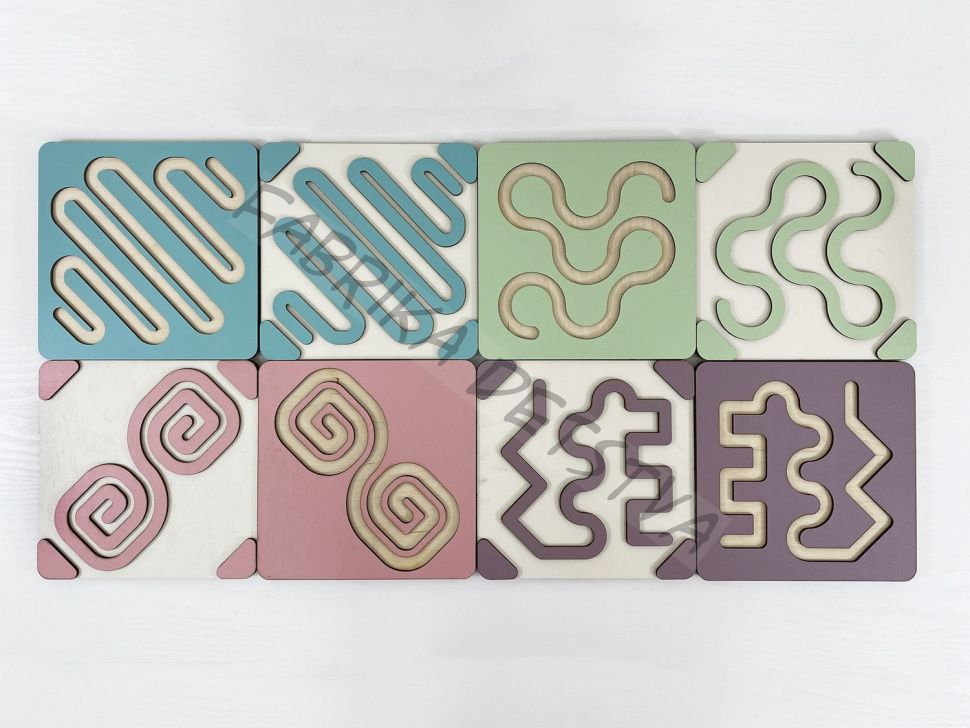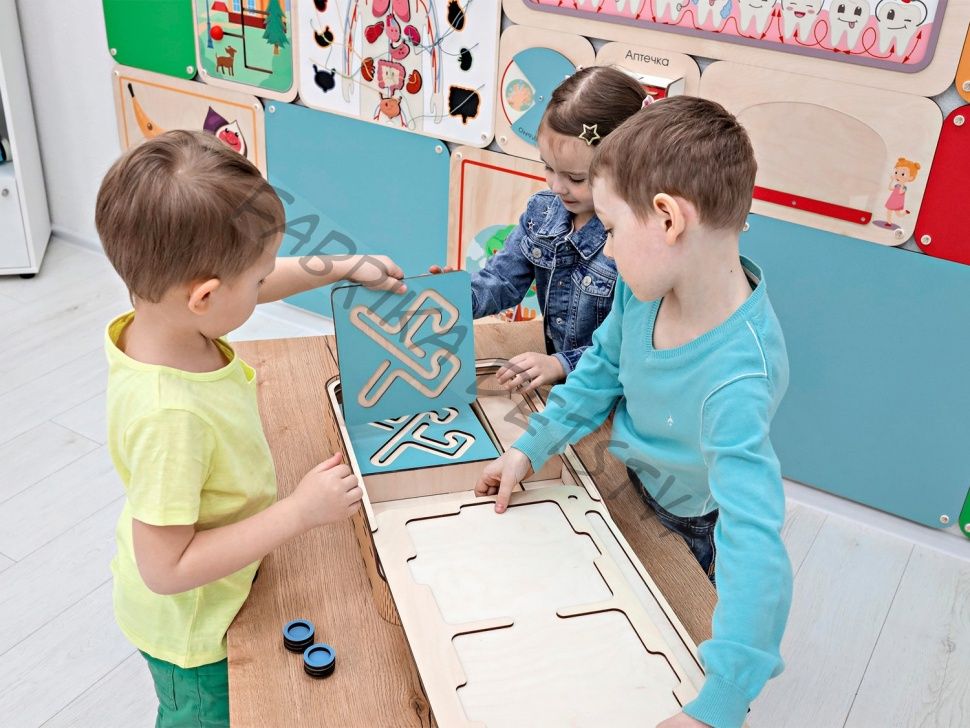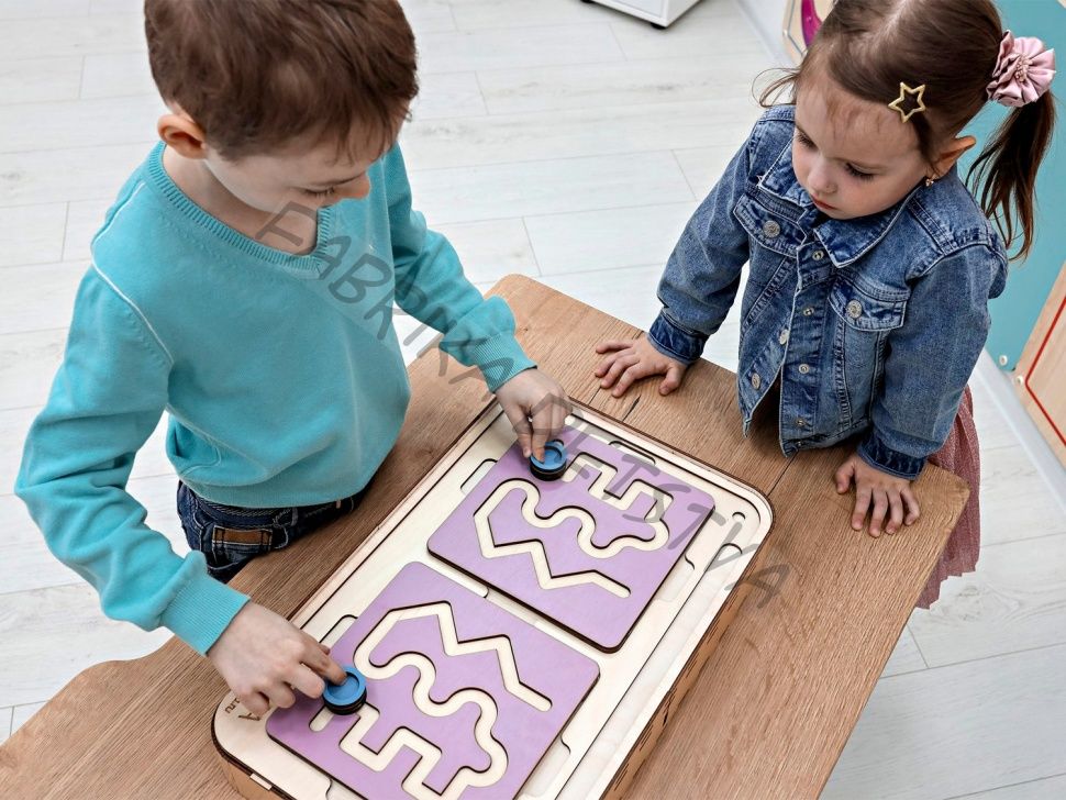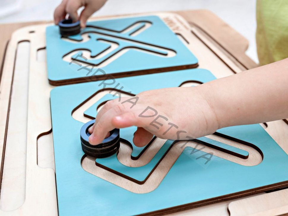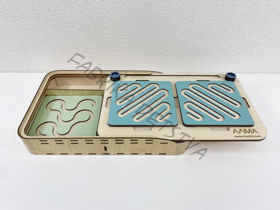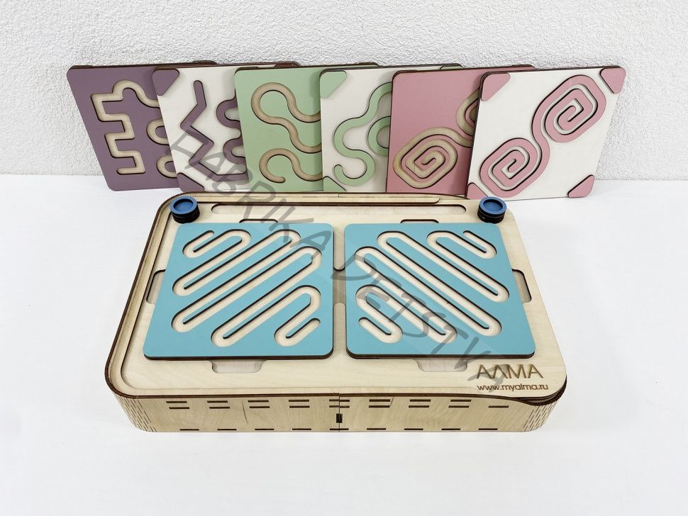 Это нейроигрушка для развития межполушарного взаимодействия. Состоит из коробки-основания и цветных лабиринтов-вкладышей. Два лабиринта с зеркально изображёнными картинками устанавливаются в пазы, и ребёнок проходит их с помощью специальных пальчиковых фишек.