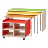 Возможные цвета: Ваниль / Голубой / Желтый / Зеленый / Красный / Оранжевый / Розовый / Синий / Белый Компактный многофункциональный модуль для развивающей деятельности со стационарным тумбой-столом высотой 64 см, прямоугольными выкатными столами на метал.ножках высотой 58 и 52 см и тумбой на колесах с корзинами для игрушек, мелких и крупных элементов игр, пособий для рисования, лепки и прочего. Каждый стол предназначен для 2 детей. Такой модуль удобно использовать в небольших помещениях для экономии пространства игровой зоны. В комплект входят: Тумба - стол 115х56х64 см; Стол прямоугольный на мет. ножках выкатной, 110х50х58 см; Стол прямоугольный на мет. ножках выкатной, 93х50х52 см; Тумба выкатная 75х45х43; Набор корзин 4 шт. Используемые материалы: ламинированное ДСП толщиной 16 мм со стойким покрытием против воздействия воды и моющих, дезинфицирующих средств, защищенное противоударной кромкой ПВХ 2мм