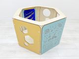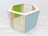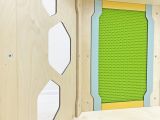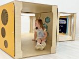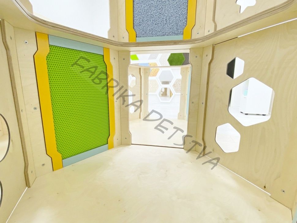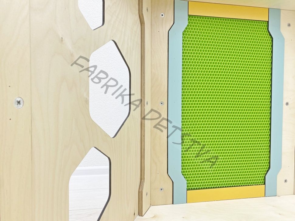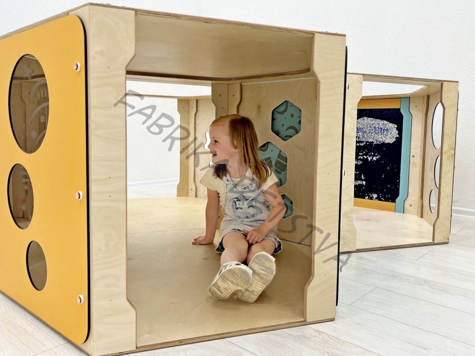 Внутри модули украшены тактильными панелями для развития сенсорной чувствительности, а снаружи – лазерной гравировкой и фигурными окошками. Они идеально стыкуются между собой и позволяют конструировать из них замки и лабиринты для маленьких непосед.