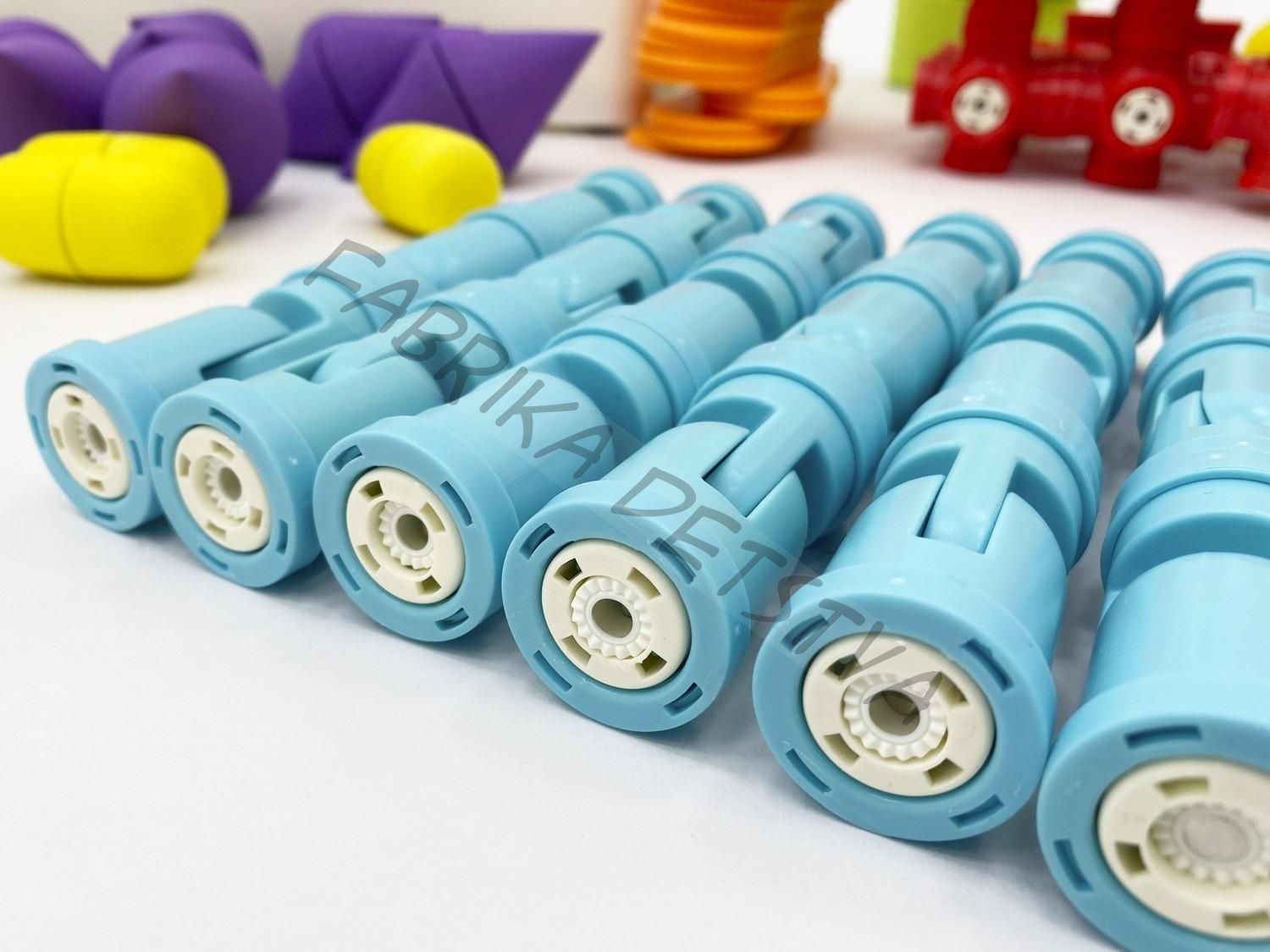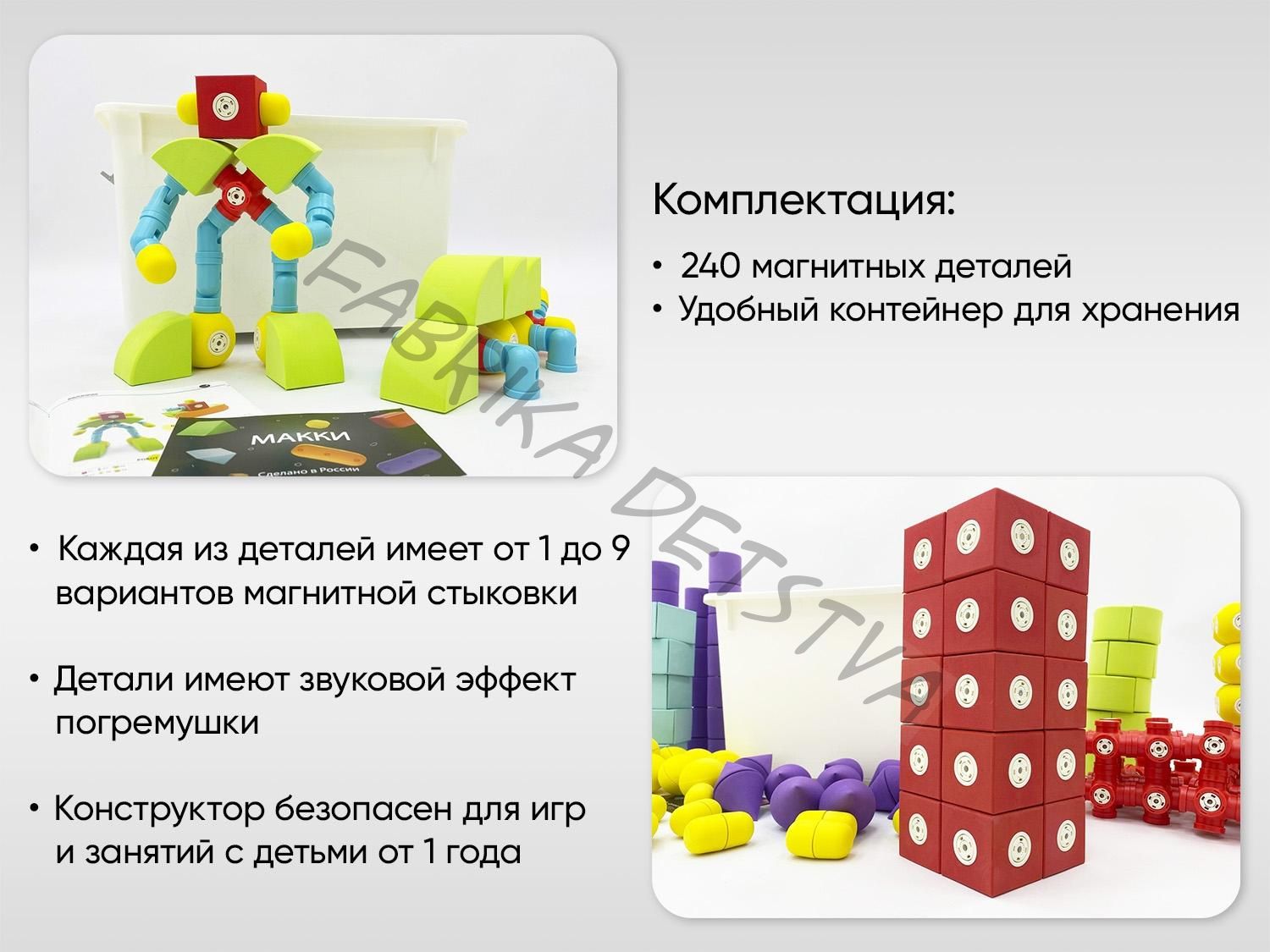 Детали конструктора окрашены в приятные однотонные цвета, со звуковым эффектом погремушки. Каждая из деталей имеет от 1 до 9 вариантов магнитной стыковки, что практически не ограничивает ребенка в конструировании. Простые детали отлично подходят для детей младшей группы ДОУ, детей с ОВЗ и РАС. Более сложные по форме и креплениям детали предназначены для детей средней и старшей группы.