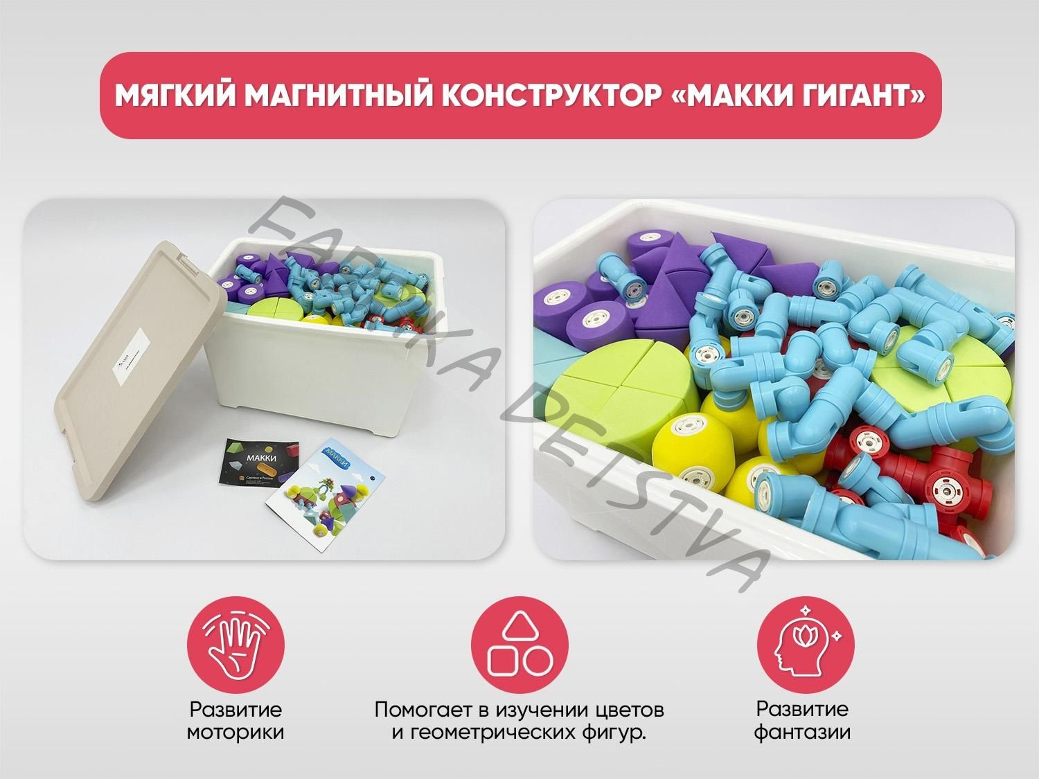 «МАККИ Гигант» отлично подходит как для совместной, так и для индивидуальной работы. Развивает сенсорное восприятие, моторику, фантазию. Помогает в изучении цветов и геометрических фигур.