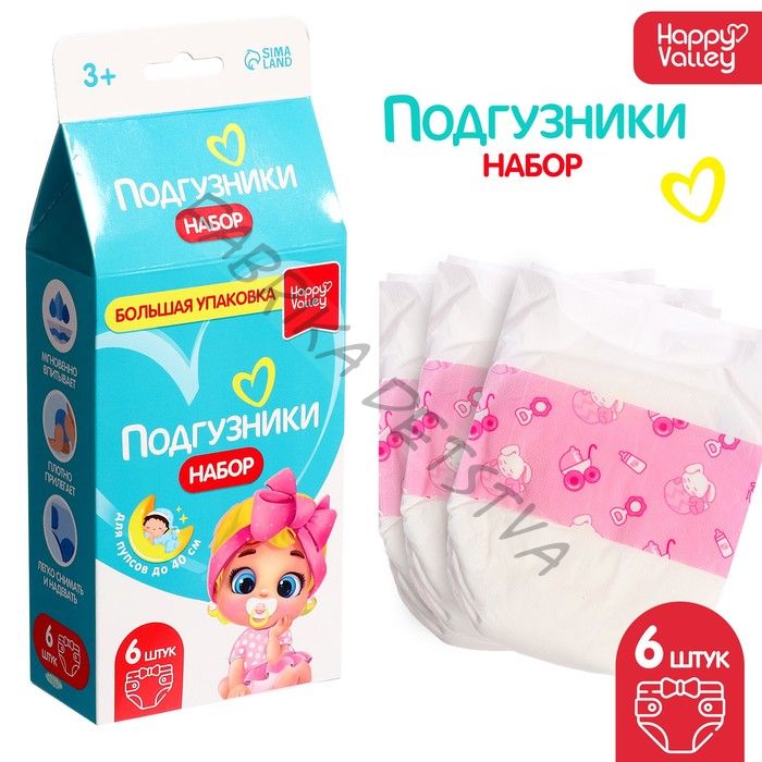 Для увлекательных игр в дочки-матери малышке необходимы разнообразные аксессуары. С подгузниками девочка будет заботиться о пупсике как о настоящем младенце. Малышка наденет их на игрушечного карапуза и отправится на прогулку. Полезное изделие поможет заменить горшок и сохранит в чистоте детские вещи. Особенности набора В наборе 6 подгузников. Подходит для пупсов ростом до 40 см, в том числе для игрушек популярных брендов. Подгузники мгновенно впитывают влагу, прямо как настоящие! Аксессуар фиксируется липучкой по бокам, что позволит регулировать обхват. А ещё с такими застёжками малышка сможет без труда переодеть куклу. Благодаря правильному крою и аккуратному пошиву аксессуар плотно прилегает к пупсу и выглядит реалистично, словно изготовлен для ребёнка. Играем с пользой В процессе игры малышка потренирует воображение и чувство стиля, эстетический вкус, моторику рук и освоит социальные роли и модели поведения взрослых. Кукла на фото представлена для демонстрации подгузника, в комплект не входит.