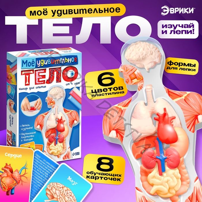 С набором для опытов «Моё удивительно тело» юный исследователь узнает о строении человеческого тела и о расположении важнейших внутренних органов, а также слепит каждый из них по отдельности. А обучающие карточки познакомят ребёнка с описанием органов и их функций. Как сделать? Внимательно рассмотрите карточки вместе с ребёнком. С помощью формочек вылепите из пластилина каждый орган. Расположите правильно в общей форме. Дополните наклейками.