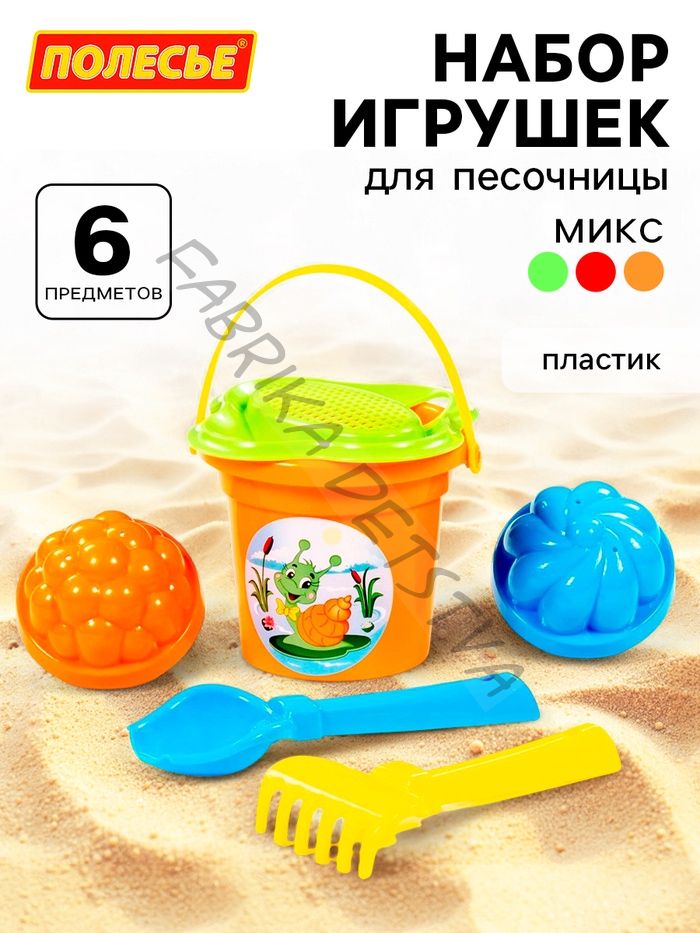 Набор игрушек для песочницы, 6 предметов: ведро, ситечко, совок, грабельки, формочки, МИКС