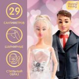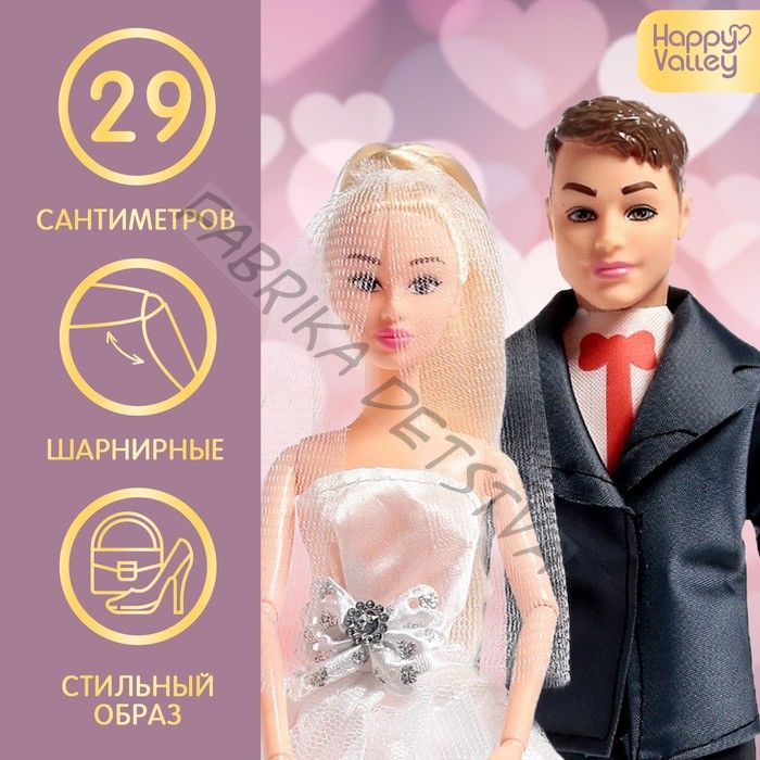 Познакомьте малышку с невестой и её женихом. Девочка с удовольствием подружится с этой сладкой парочкой. Будет о них заботиться и осваивать социальные роли и модели поведения. Ваша малышка сделает укладку на длинные волосы невесты, подберёт украшение и сумочку, а для жениха отутюжит костюм. Вместе вы придумаете сценарий свадьбы и устроите настоящее торжество! Размеры кукол: жених — 9 x 3,5 x 30 см; невеста — 7,5 x 3 x 29 см. Игрушки на шарнирах. Для детей старше 3 лет.