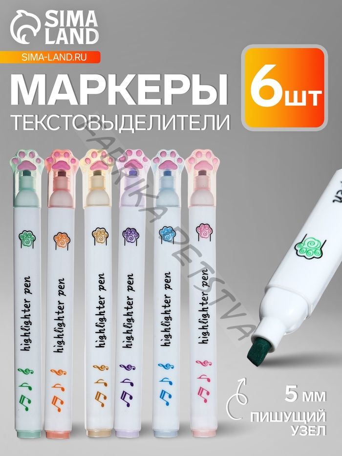 Набор маркеров-текстовыделителей «Лапки», 6 цветов, скошенный наконечник, узел 5 мм
