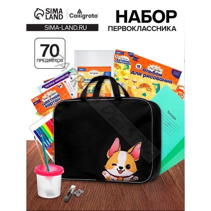 Набор первоклассника, 70 предметов, Calligrata «Корги», с пособиями, в папке