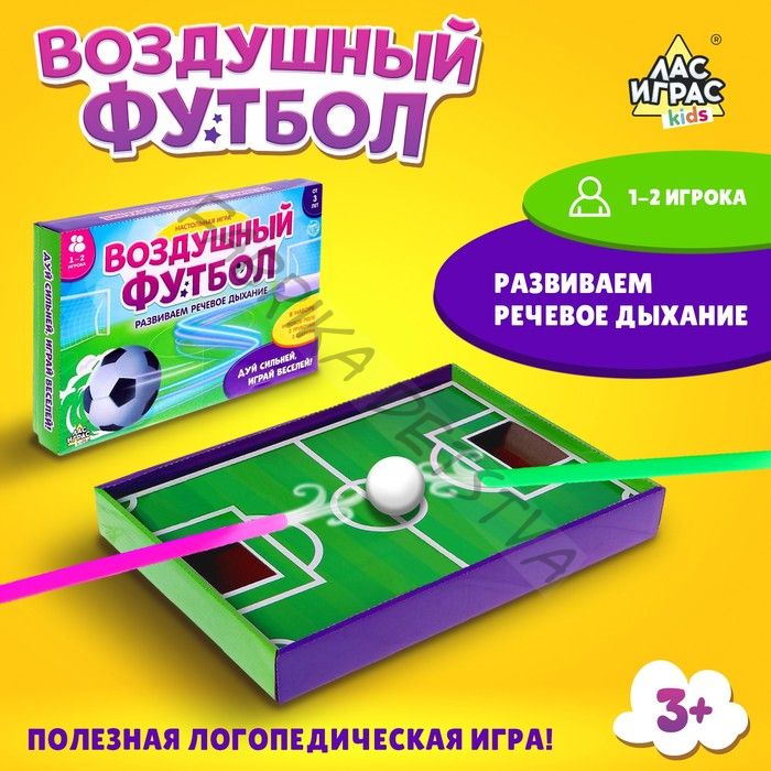 Настольный «Воздушный футбол» — интересная и полезная логопедическая игра! Развивает речевое дыхание, формирует сильный и плавный ротовой выдох. Эти упражнения помогут ребёнку исправить недостатки речи и научиться управлять артикуляционным аппаратом. Цель игры — загнать больше шариков в ворота соперника. Как играть? Установите шарик в центр поля, возьмите трубочки и по команде одновременно дуйте на него. Усложняйте игру, попросите кроху забивать не напрямую, а с помощью удара о боковую стенку. Для одного игрока задание — дуть на шарик в правый и левый угол, как будто передавая мяч сопернику. Расскажите малышу, как правильно выполнять ротовой выдох: сделайте спокойный вдох; выдыхайте воздух правильно, без толчков; при выдохе складывайте губы трубочкой (не надувайте щёки и не сжимайте губы); во время выхода воздух должен выходить через рот, не через нос. Игра рекомендована детям старше 3 лет и рассчитана на 1–2 участников. Дуйте сильней — играйте веселей!