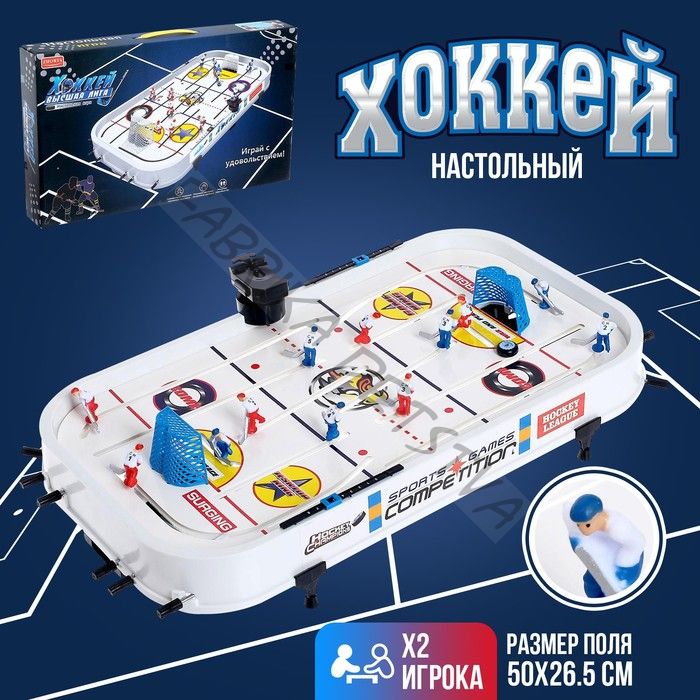 Играть в хоккей можно не только зимой на улице, а ещё и круглый год дома с друзьями. Это азартное хобби по душе и детям, и взрослым. Устройте своё сражение за шайбу. Каждая команда состоит из шести хоккеистов. Управляя ими с помощью рычагов, постарайтесь забросить шайбу в ворота соперника. Фигурки хоккеистов можно передвигать вперёд, назад и вокруг своей оси, что делает управление более манёвренным, а игру — интересной. Играя в настольный хоккей, малыши научатся принимать незамедлительные решения, разовьют логику, быстроту реакции и мелкую моторику. Размер игрового поля: 47 x 27 см. Товар предназначен для детей от 6 лет.