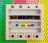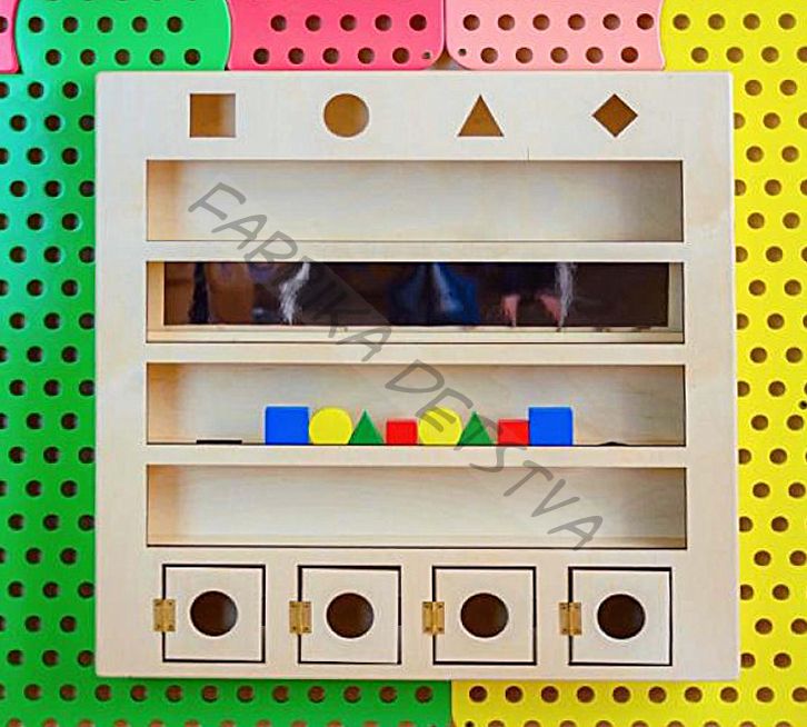 Ребенок учится вкладывать объёмные геометрические фигуры: цилиндр, куб, треугольную и прямоугольную призму в соответствующие отверстия в различных направления: сверху вниз, сверху вниз с зеркальным контролем и от себя. В нижнем ряду требуется не только вложить фигурки, но и открыть дверцу, чтобы достать их.